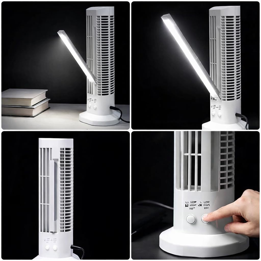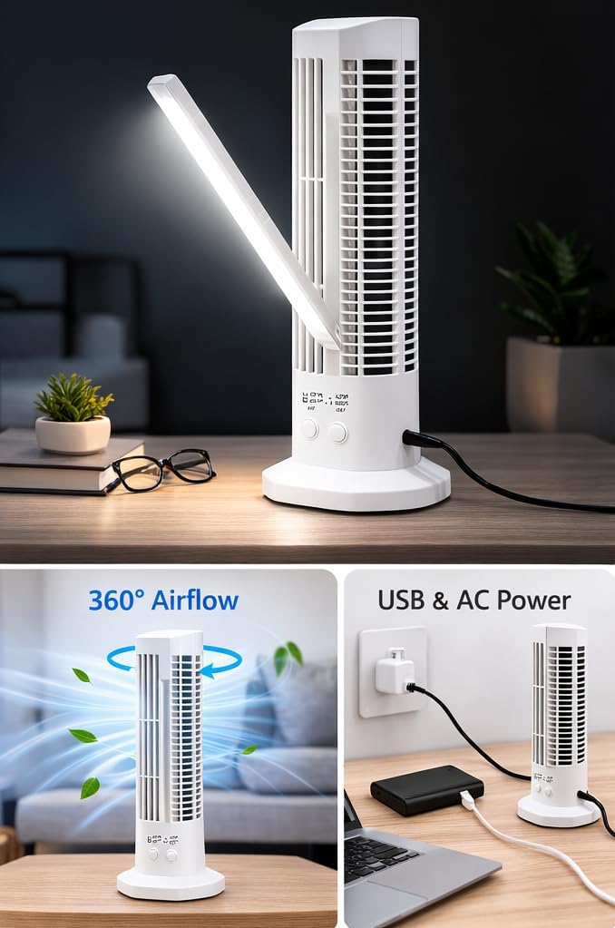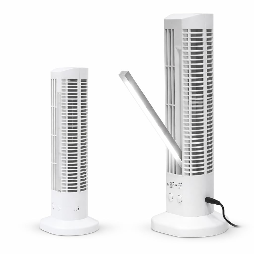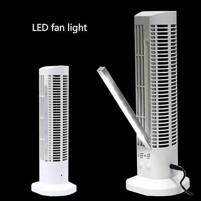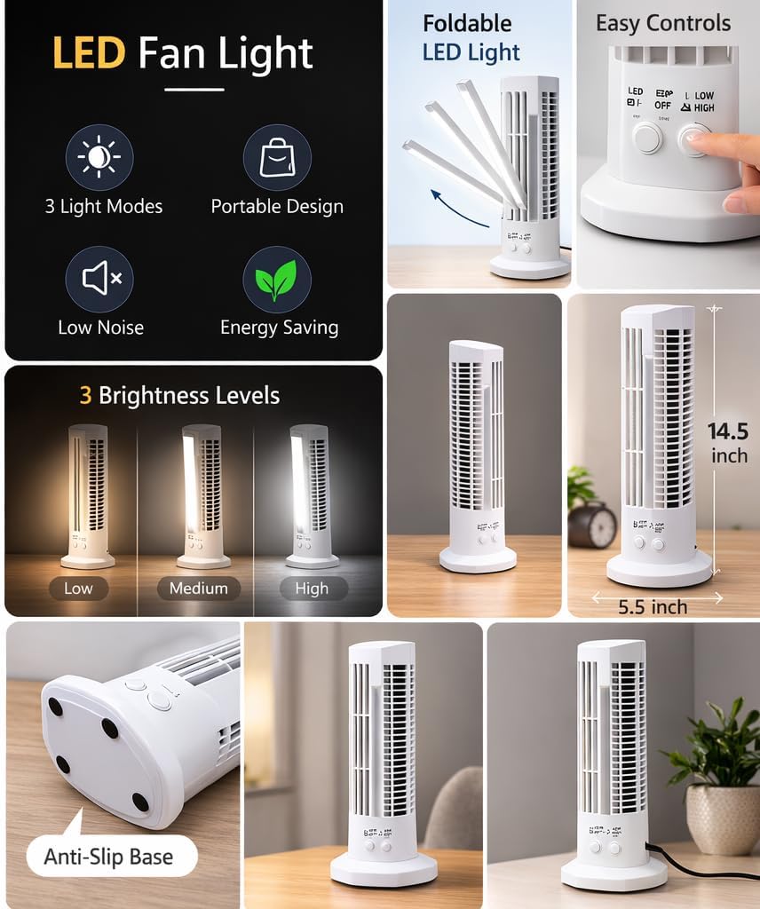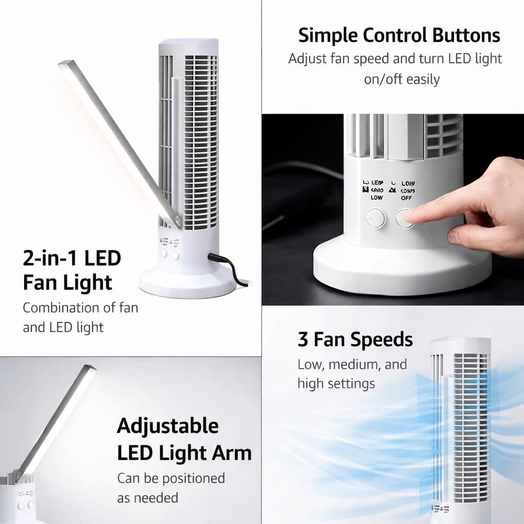 - Vertical tower fan structure with an integrated foldable LED light arm. The light panel can be opened outward from the body and positioned at different angles as shown in the images.