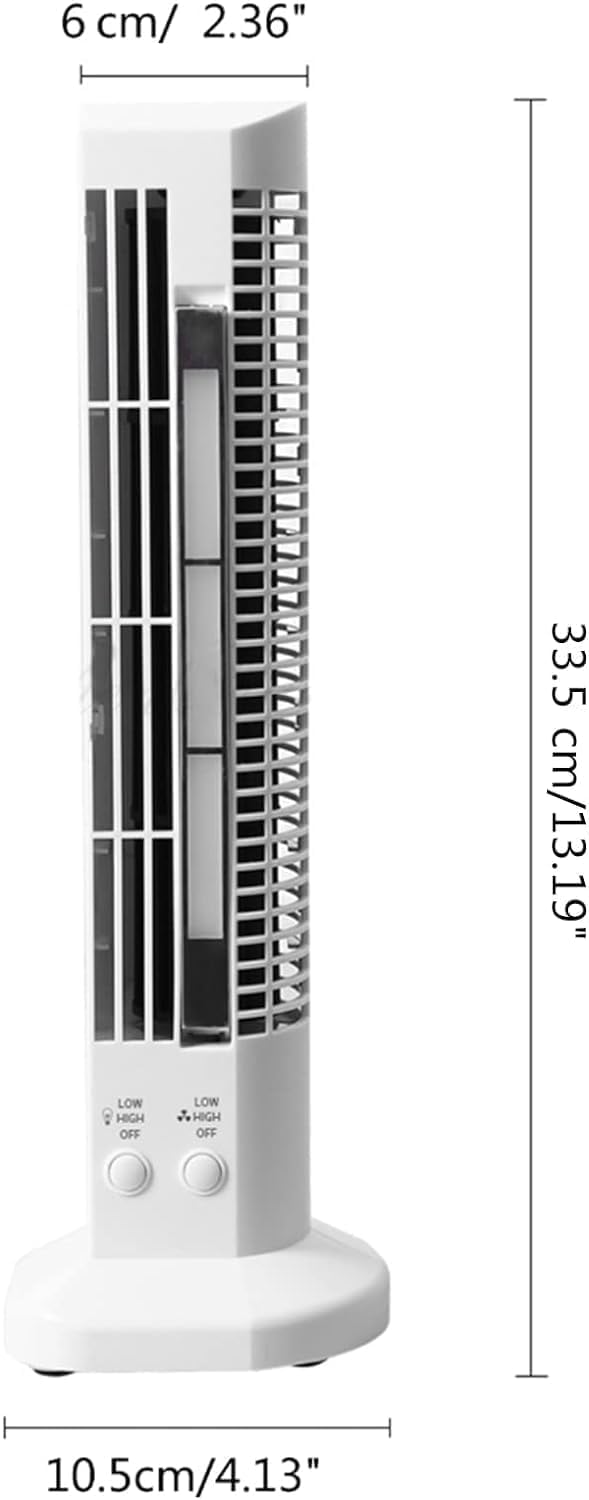 - Tall cylindrical body with multiple vertical vent openings around the fan housing. The design allows airflow from the vented sections of the tower.