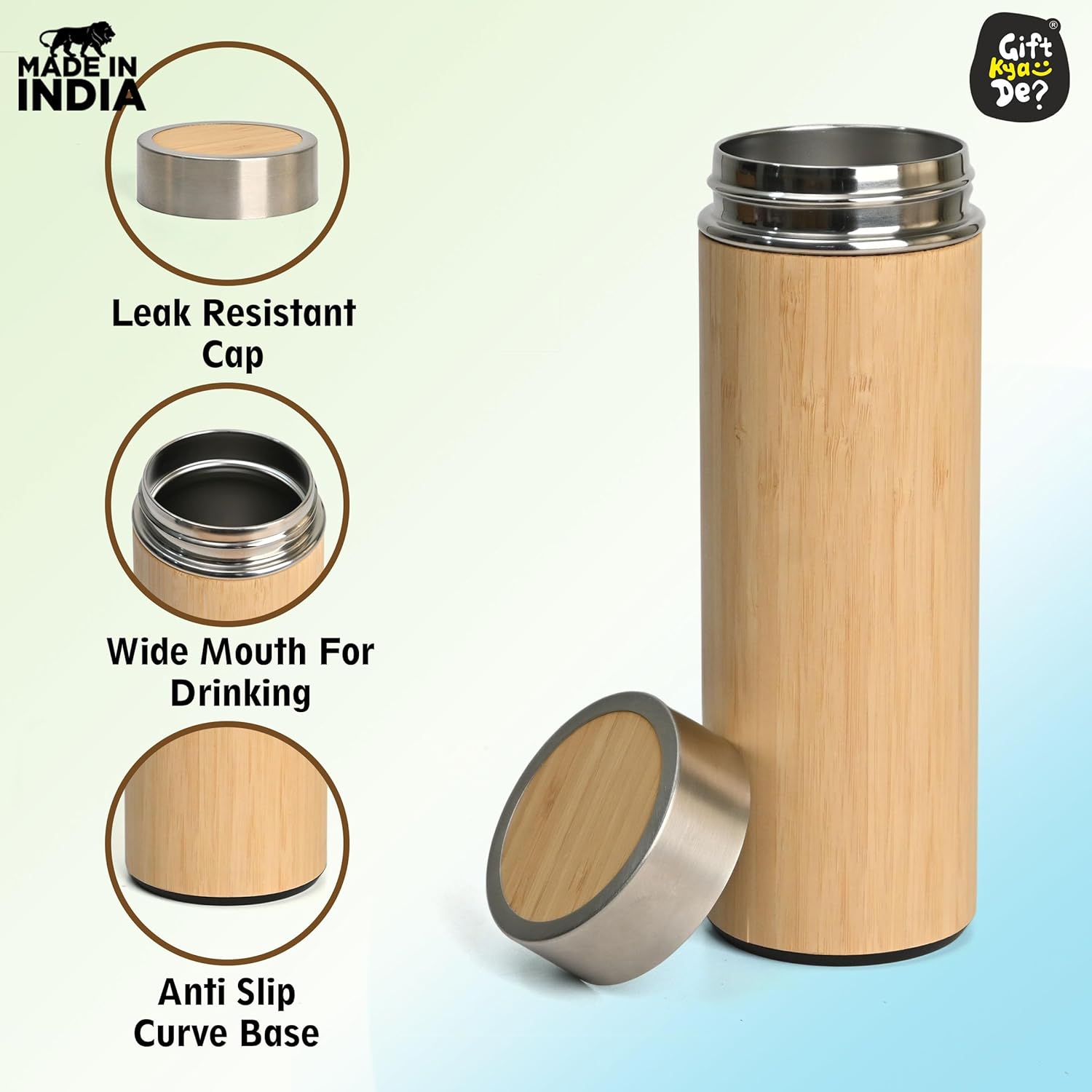 GKD Eco-Friendly Bamboo Water Bottle, Stainless Steel Flask Water Bottle/Thermos with Tea Strainer | Double Wall Vacuum Insulated | Hot & Cold, 500ml