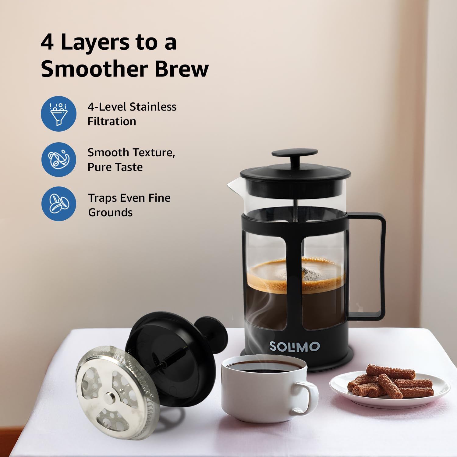 - Advanced 4-Level Filtration: Enjoy a smooth, ground-free brew thanks to the four-level filtration system, which includes a stainless steel mesh filter and plunger for a clean and flavorful result.