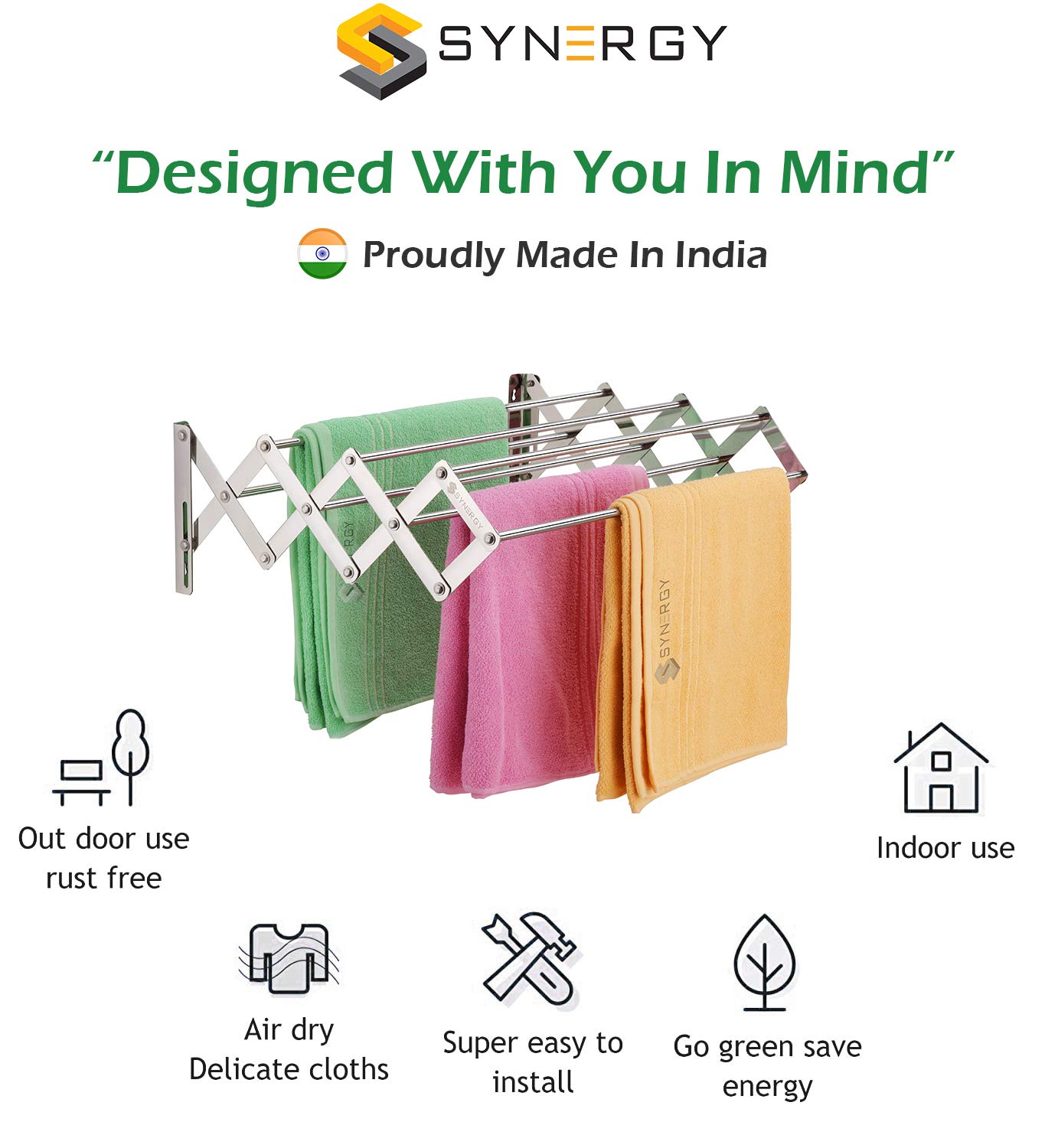 Synergy – 7 Rods – Premium Heavy Duty Stainless Steel Clothes Drying Stand Wall Mounted | Cloth Hanging Stand | Clothes Drying Stand for Balcony | Foldable Cloth Hanger for Drying [SY-CS3]