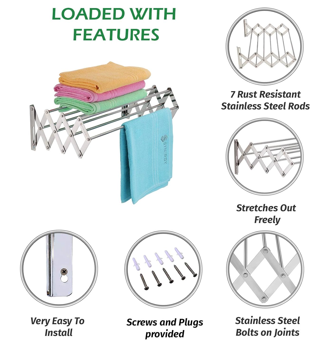 Synergy – 7 Rods – Premium Heavy Duty Stainless Steel Clothes Drying Stand Wall Mounted