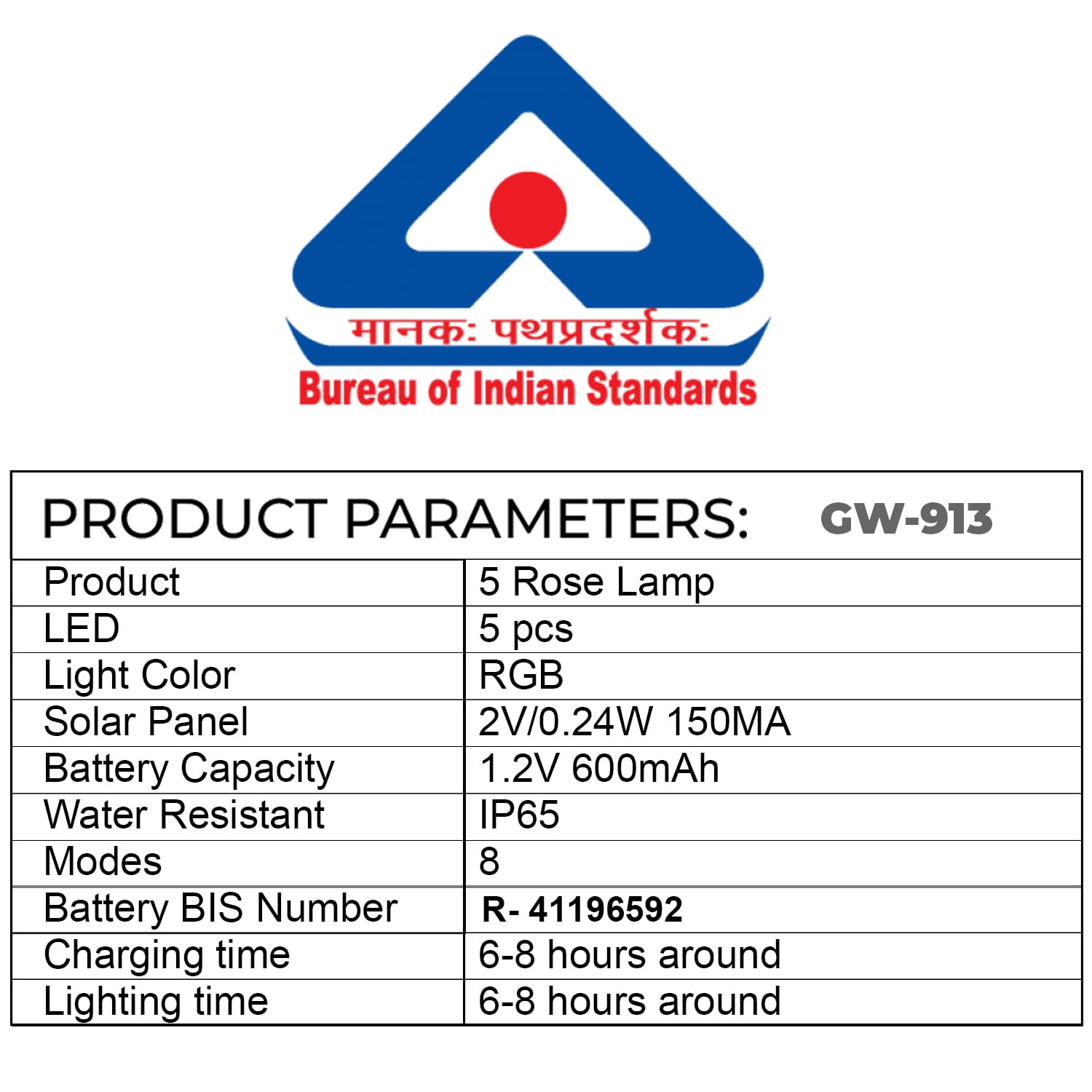 GIGAWATTS GW-913 Rose Solar Flower Light | 5 LED Color Changing Solar Flower Lights for Garden with 600mAh Battery, IP65 Waterproof, BIS Approved Outdoor Garden Decoration Lamp (Pack of 1, RGB)