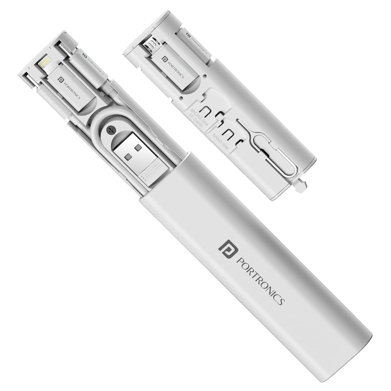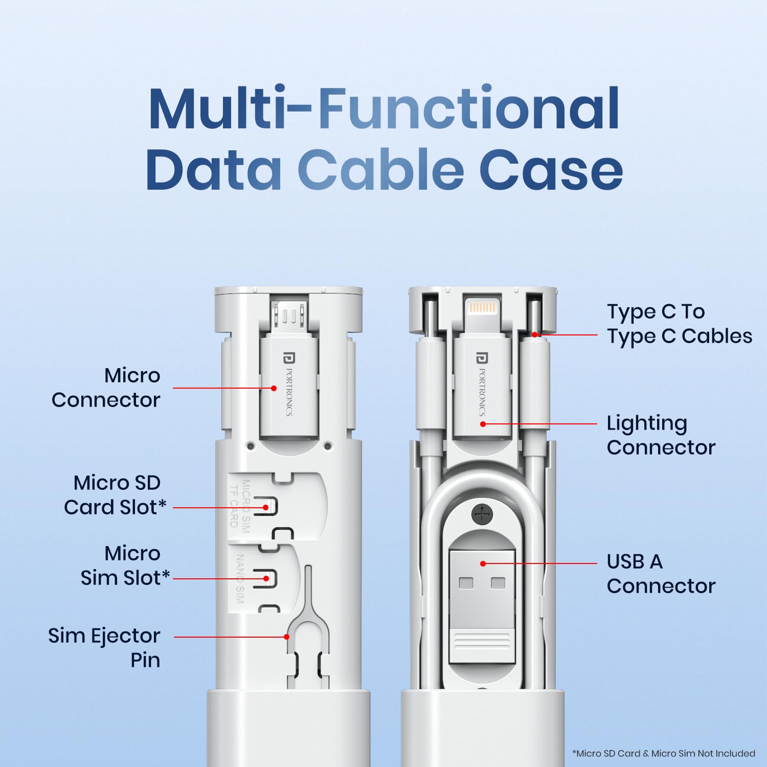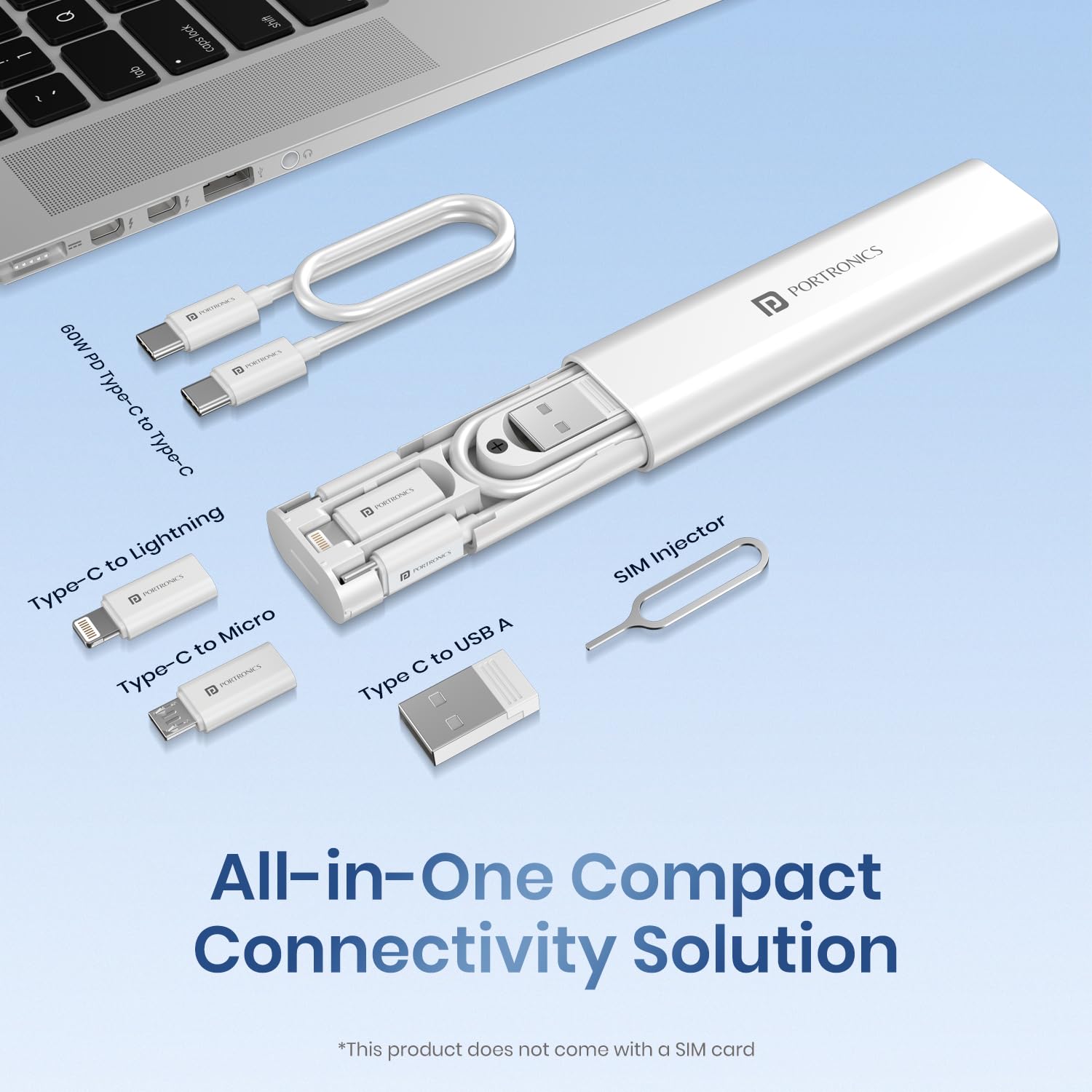 Portronics Snapcase 3 60W Multifunctional Fast Charging Data Cable Kit, Conversion Set USB A & Type C to Male Micro/Type C/Lightning, Data Transfer, Sim Storage, Sim Eject Pin, Pocket Size(White)