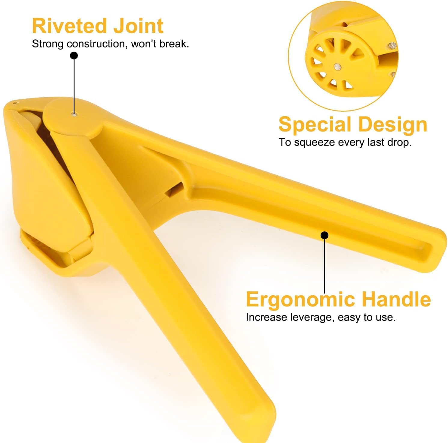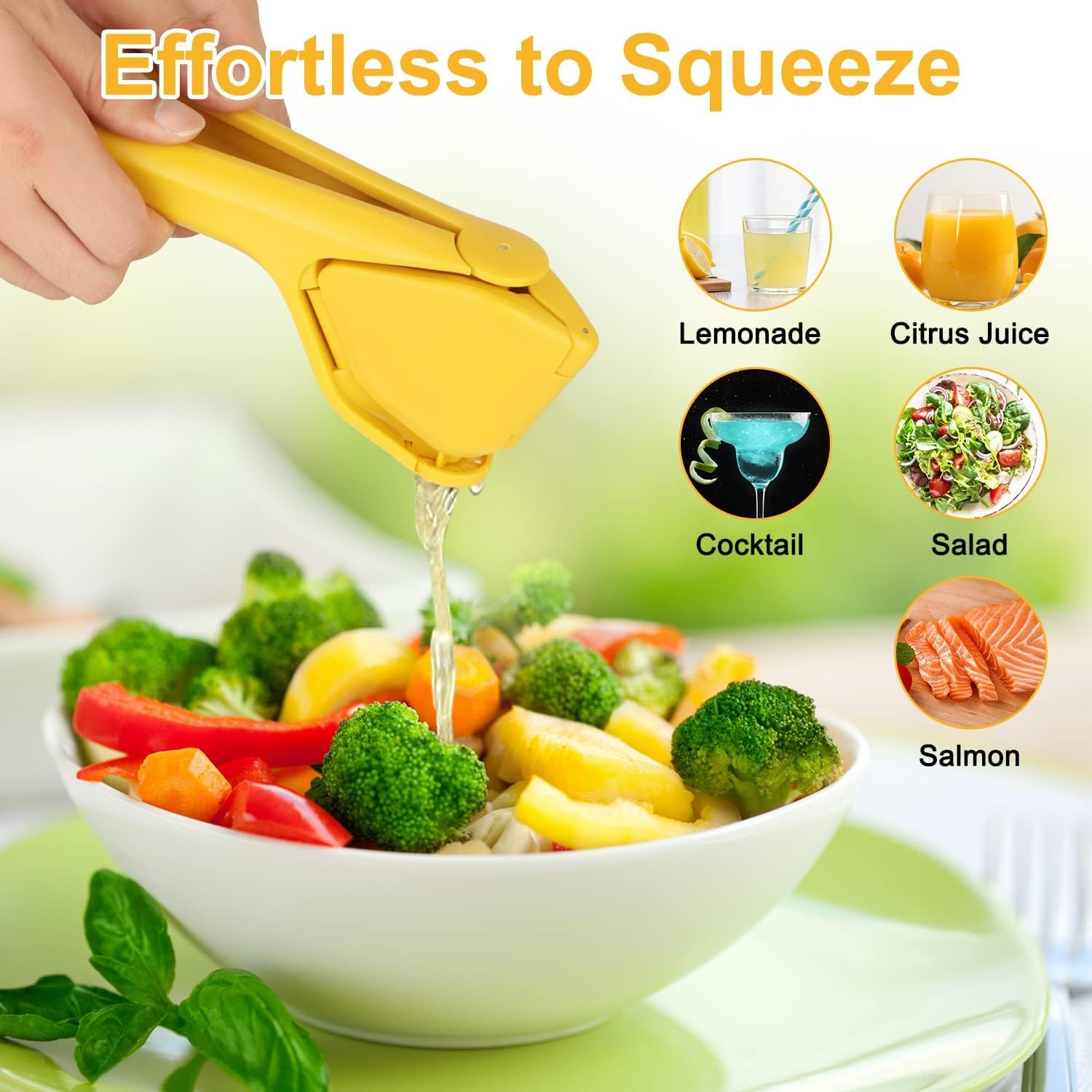 - EFFICIENT MANUAL LEMON JUICER: A lemon squeezer will require less effort than a traditional press. Lemon juicer squeezer has Long handles which can create additional leverage. Two-handed sideways pivot operation provides increased leverage using the larger muscle groups of your arms instead of your hands.
