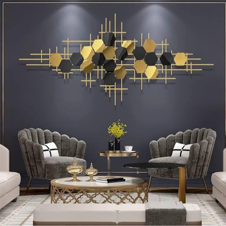 ULTRA SHINE HOME DECOR 3D Creative Hexagon & Lines Geometric Metal Wall Art for Home Decoration, Bedroom, Living Room, Hotel & Restaurant Decor (52 x 25 Inch)