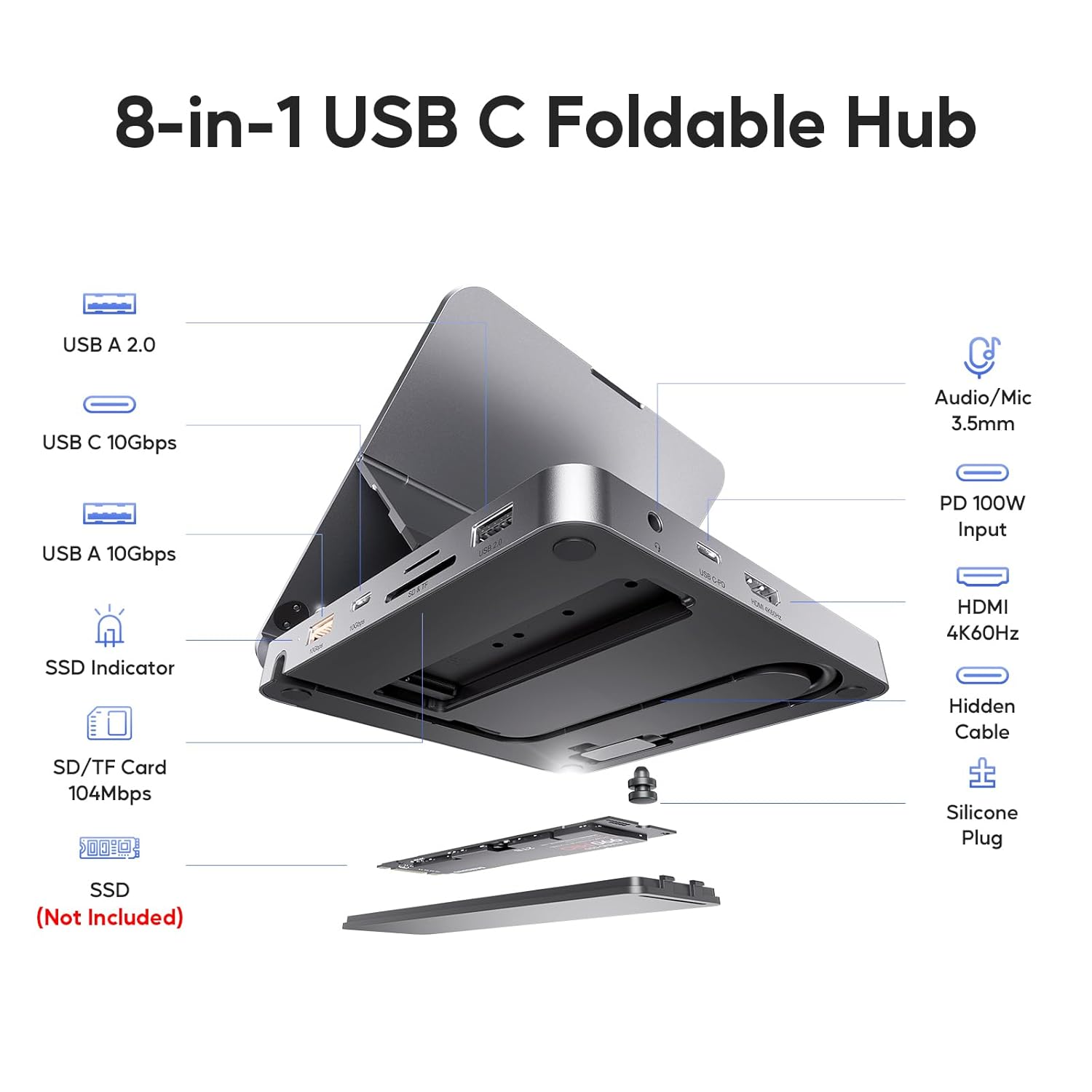 USB C Hub for iPad Pro, Docking Station for iPadM4, 4K@60Hz HDMI, 100W PD Aluminum Hub with SSD Enclosure, Stand Dock for i-Pad Mini 6th Gen, No Support Lightning Port