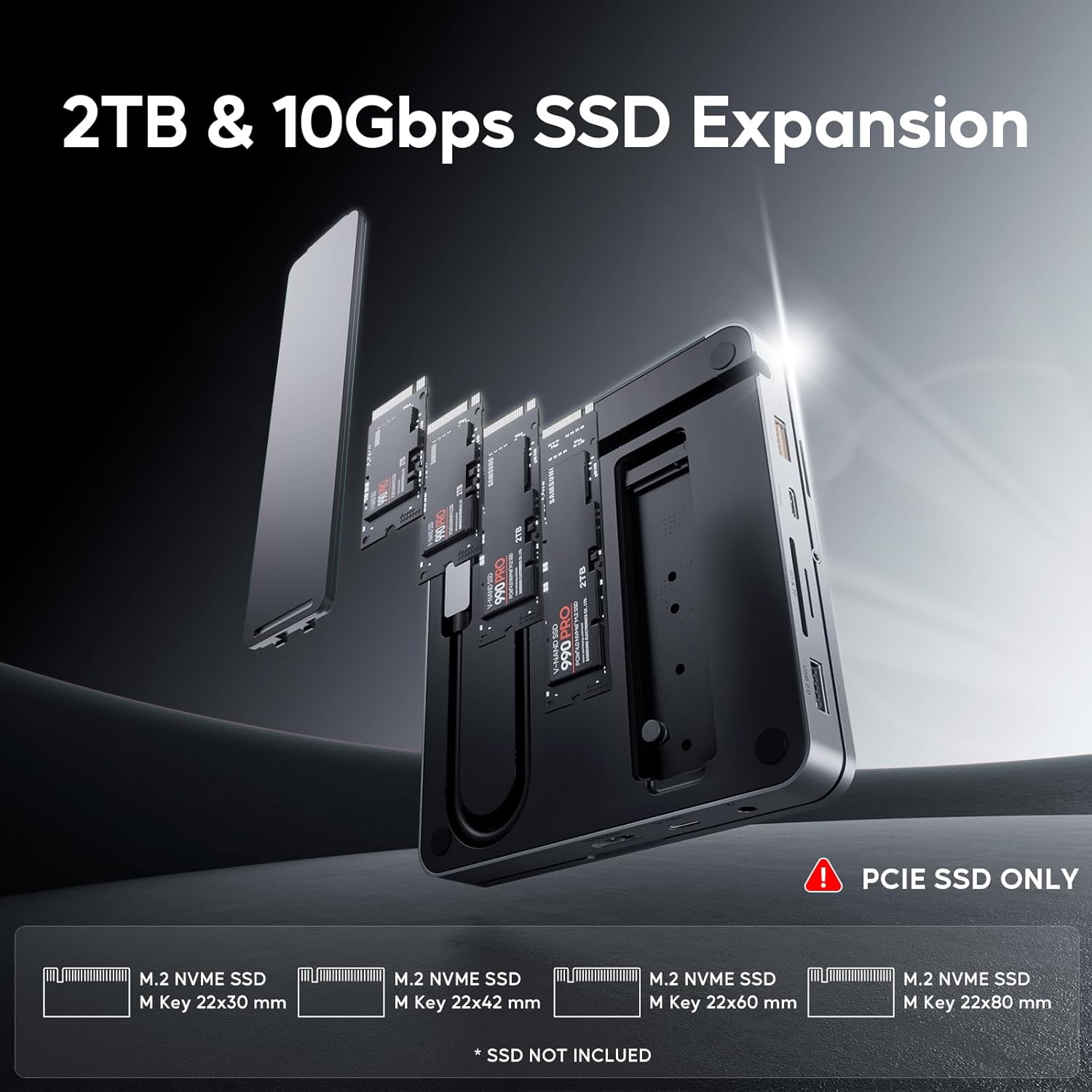 • 【Expand Storage with SSD Enclosure】This ipad pro dock supports SSD expansion to expand external solid state drive to meet your iPad/tablet storage shortage needs, supporting disks up to 2TB. USB-C HUB supports M.2 PCIe NVMe SSD 16Gbps interface and is compatible with M.2 NVMe SSD and 2230/2242/2260/2280 size M.2 SSD. 【Note】: SSD is not included. Only PCID SSD is supported, not for SATA SSD. Please make sure the SSD drive is inserted correctly and erase the SSD when using a new drive.